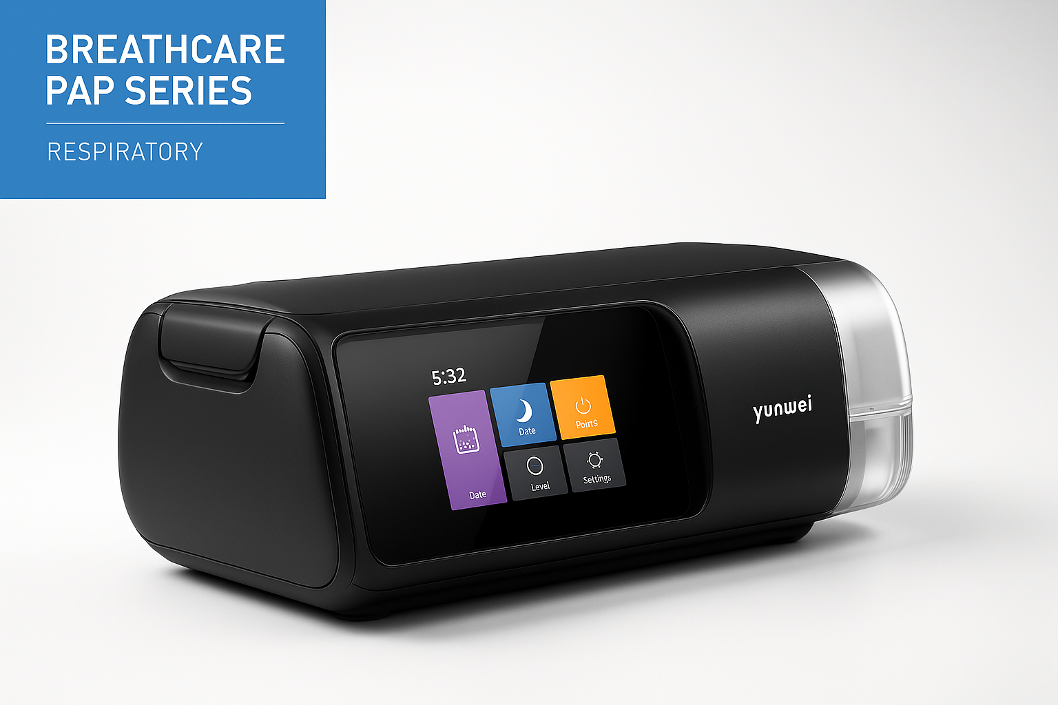El sistema Breathcare PAP Series está diseñado para el tratamiento efectivo de la apnea obstructiva del sueño (AOS) y otros trastornos respiratorios del sueño. Proporciona presión positiva continua en las vías respiratorias, manteniéndolas abiertas durante el descanso y asegurando una mejor oxigenación, reducción de ronquidos y un sueño reparador.
